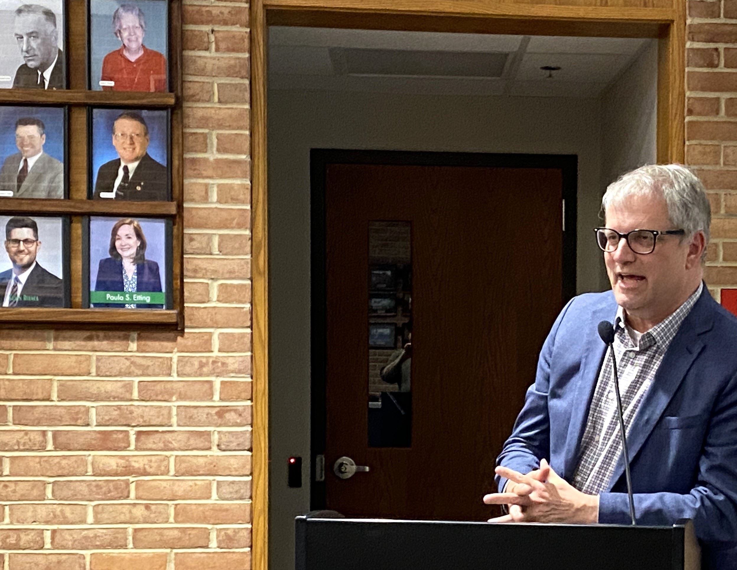 “Welcome Mr. Bayer, we’re so happy to have you here,” Mayor Paula Etting told the new director, who attended the Town meeting.Michael Bayer speaker at Town Hall after appointment as Planning Director approved